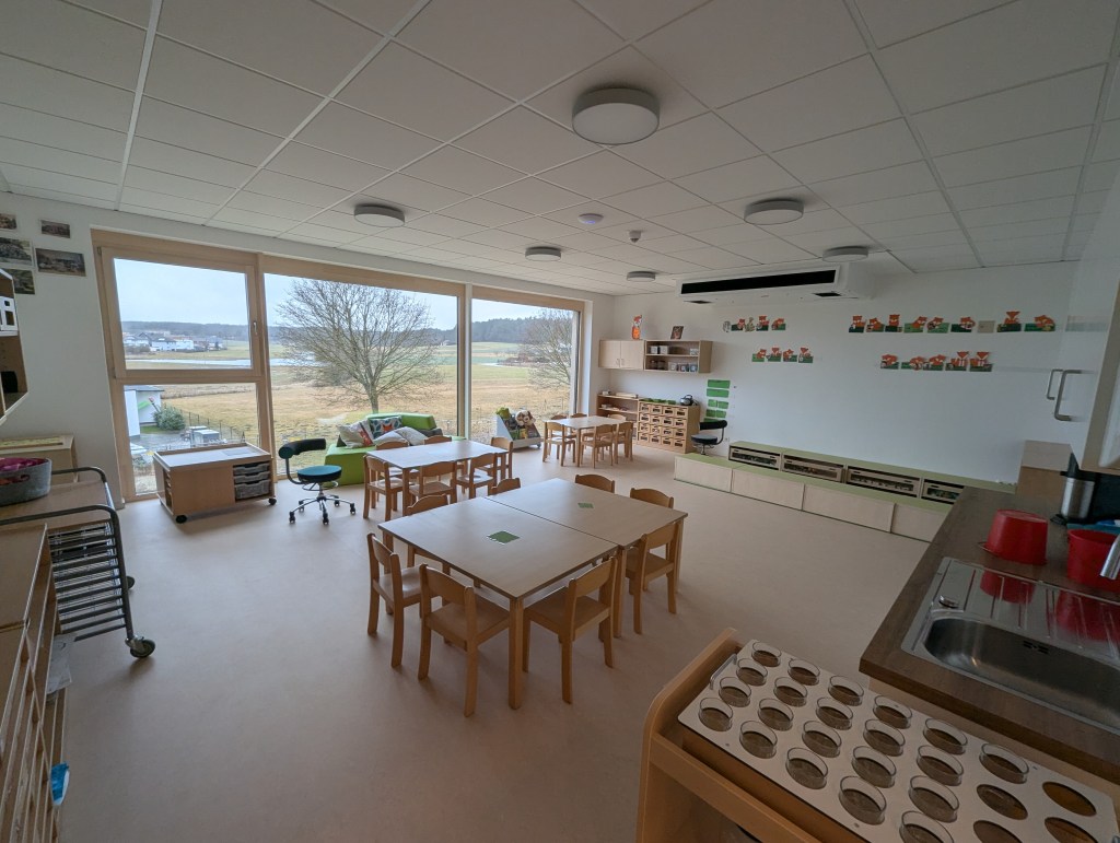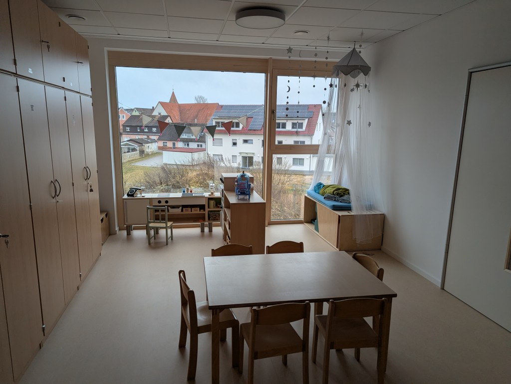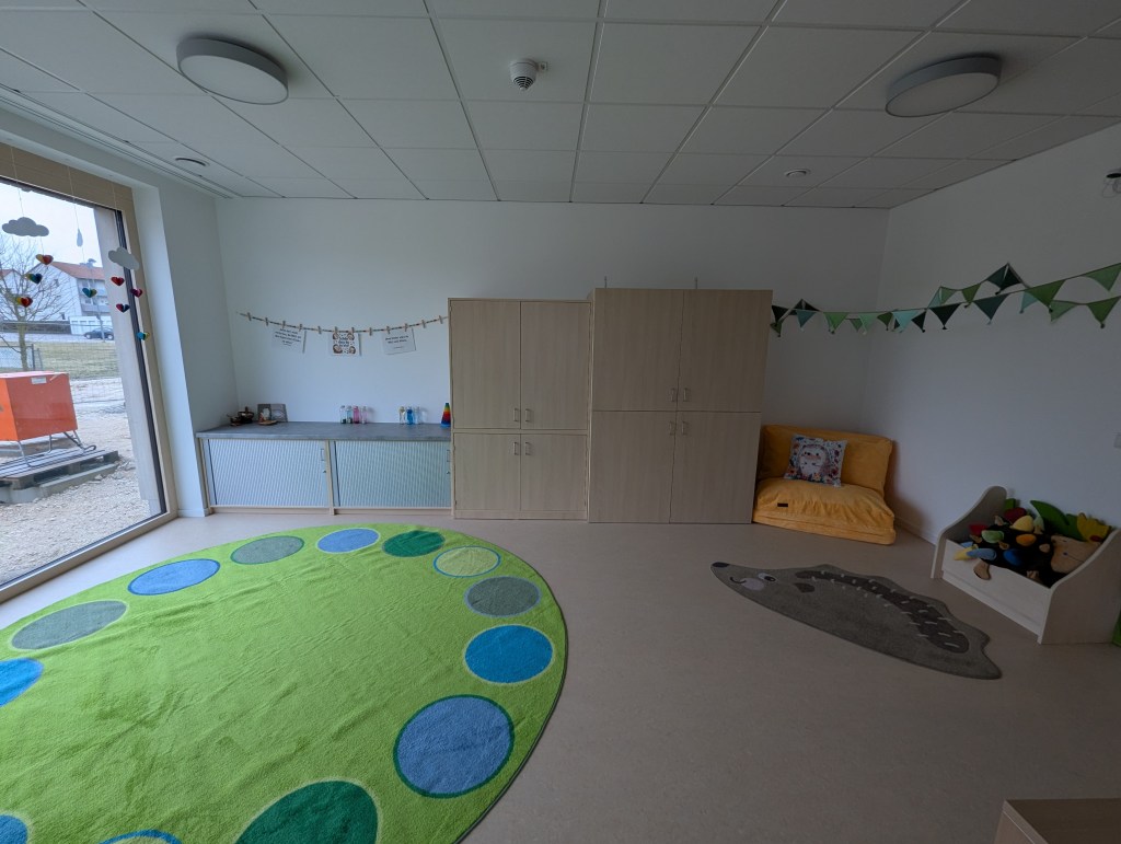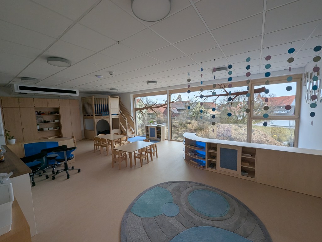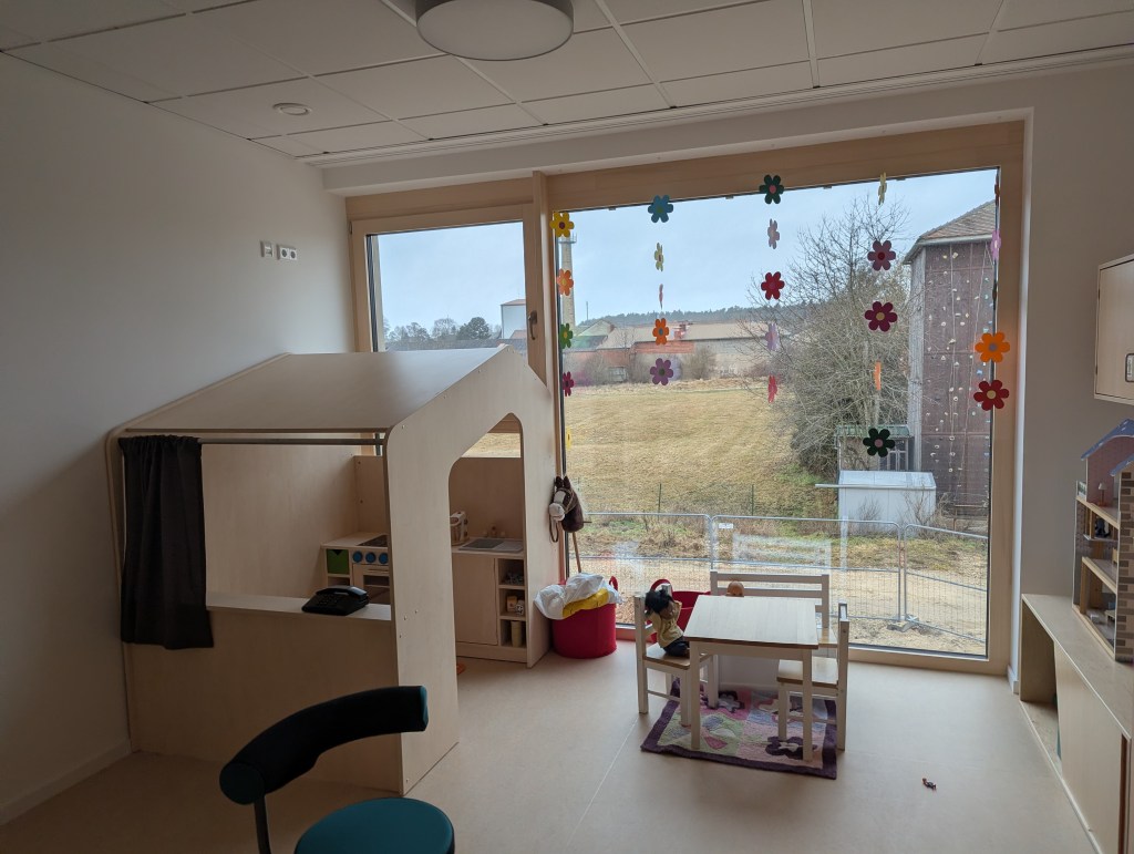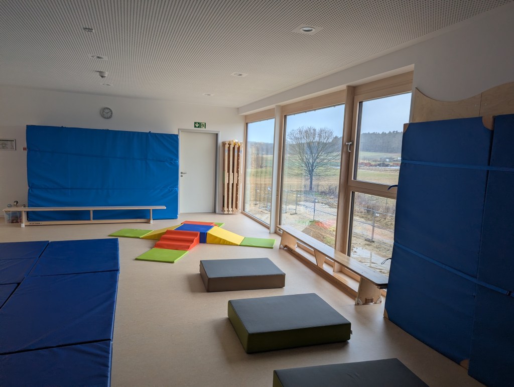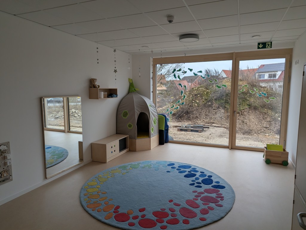 Seit dem 23. Februar 2026 sind wir in unserem Neubau in der Ziegeleistraße in Bechhofen. Wir haben zwei Krippengruppen, eine Mischgruppe und zwei Regelgruppen, dazu einen Bewegungsraum, zahlreiche Nebenräume, unsere Garderoben und einen großen Garten.