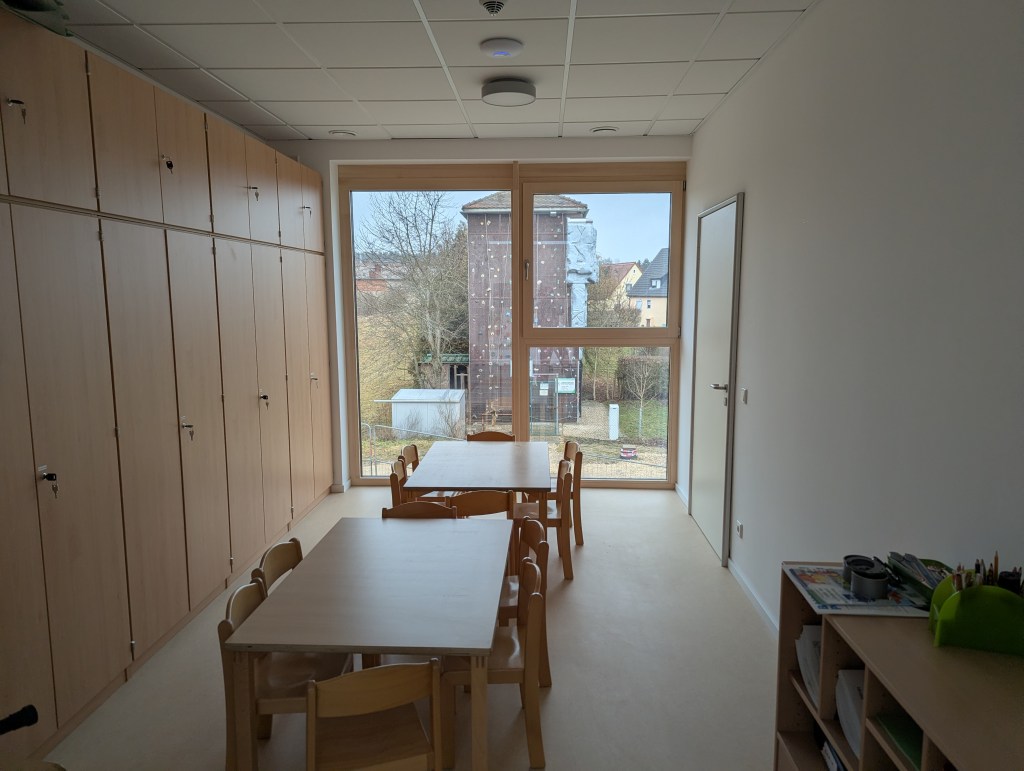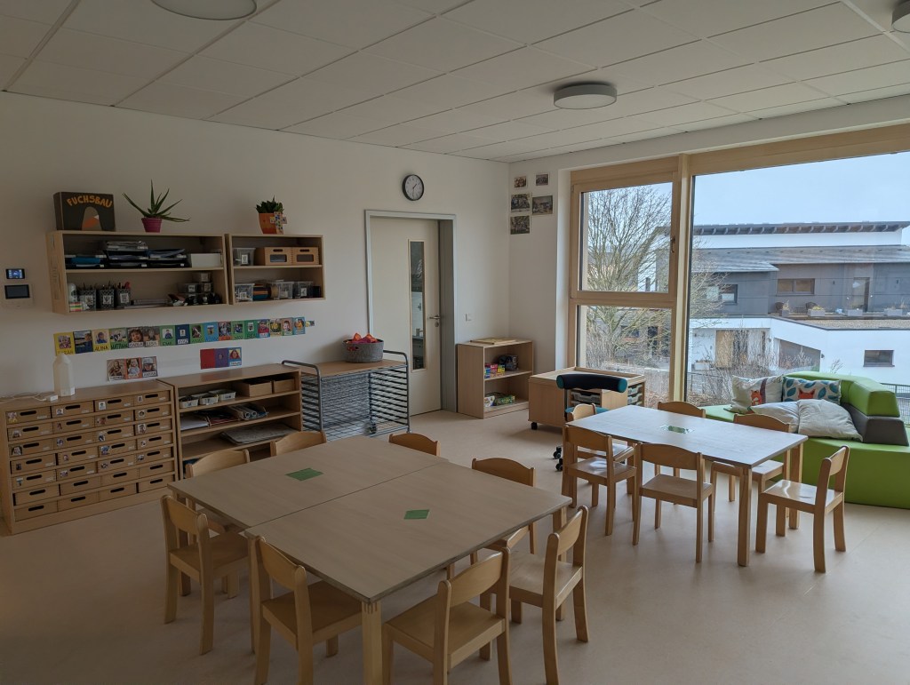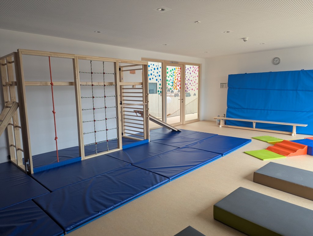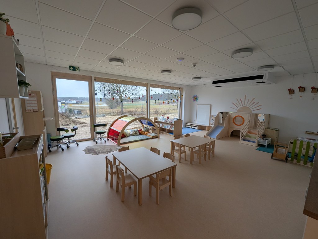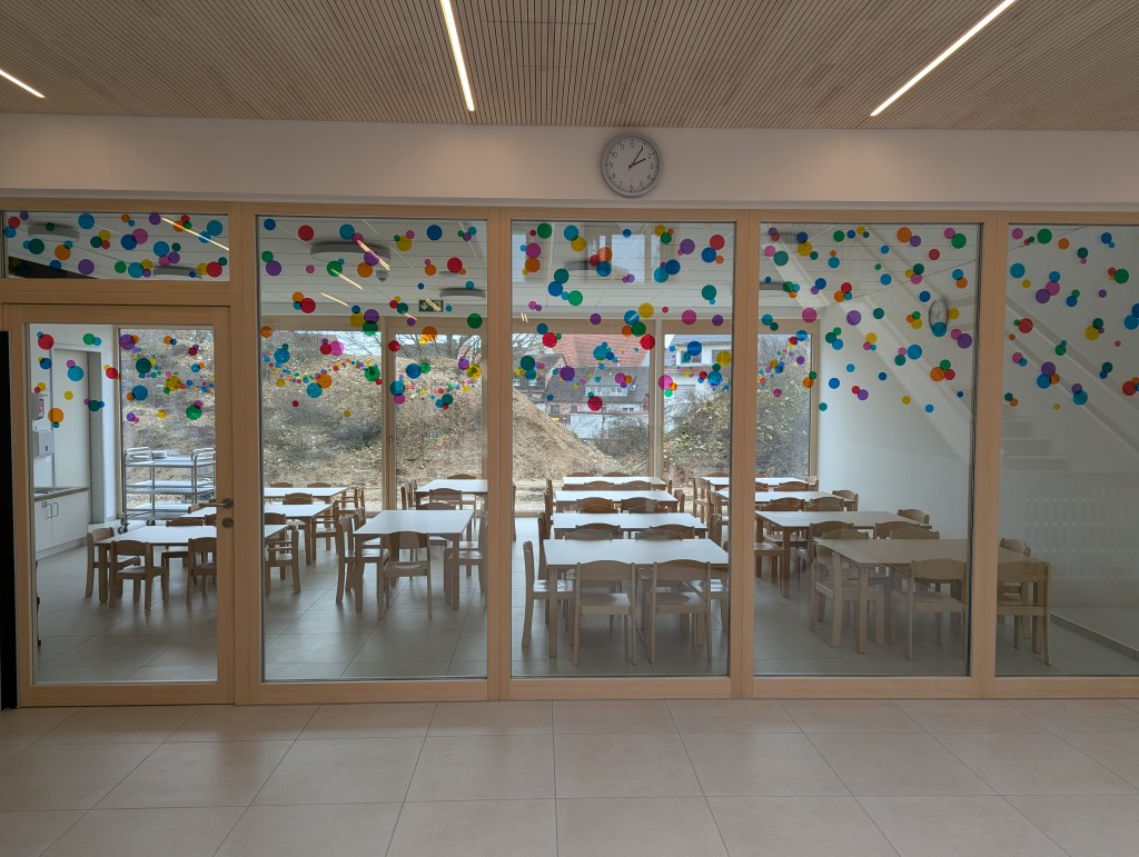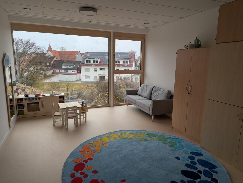 Seit dem 23. Februar 2026 sind wir in unserem Neubau in der Ziegeleistraße in Bechhofen. Wir haben zwei Krippengruppen, eine Mischgruppe und zwei Regelgruppen, dazu einen Bewegungsraum, zahlreiche Nebenräume, unsere Garderoben und einen großen Garten.