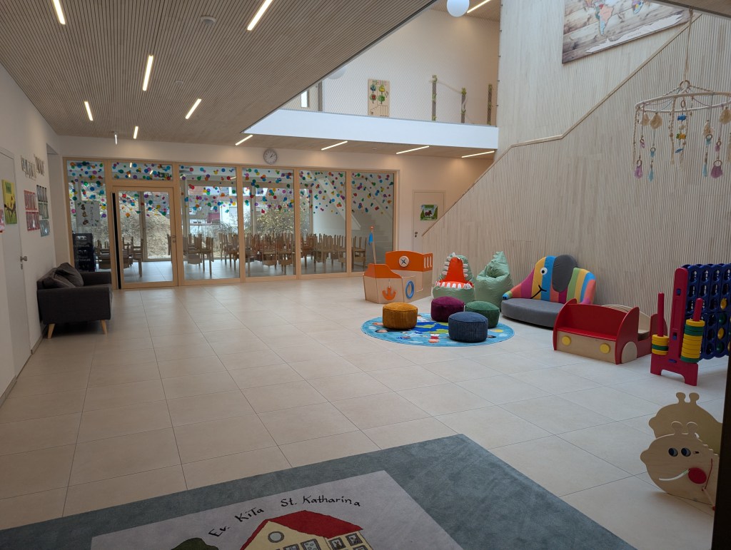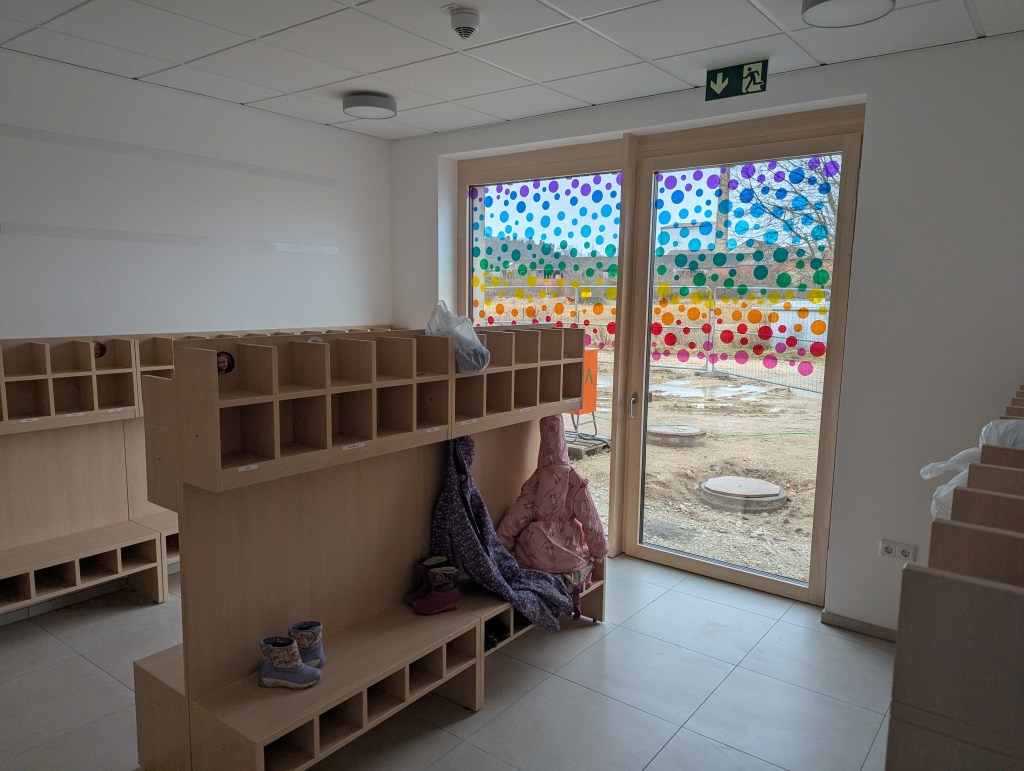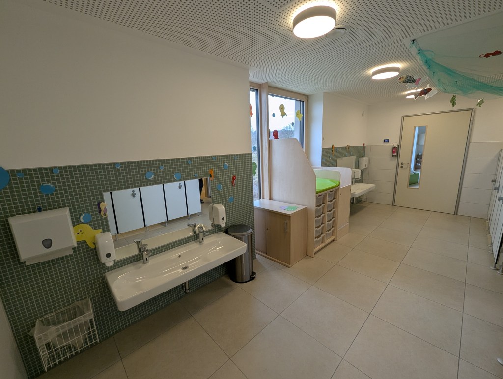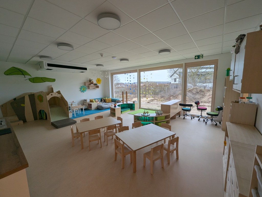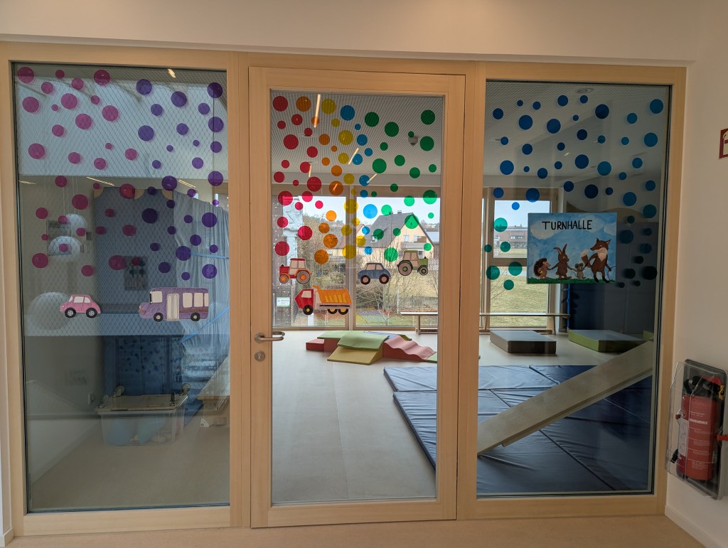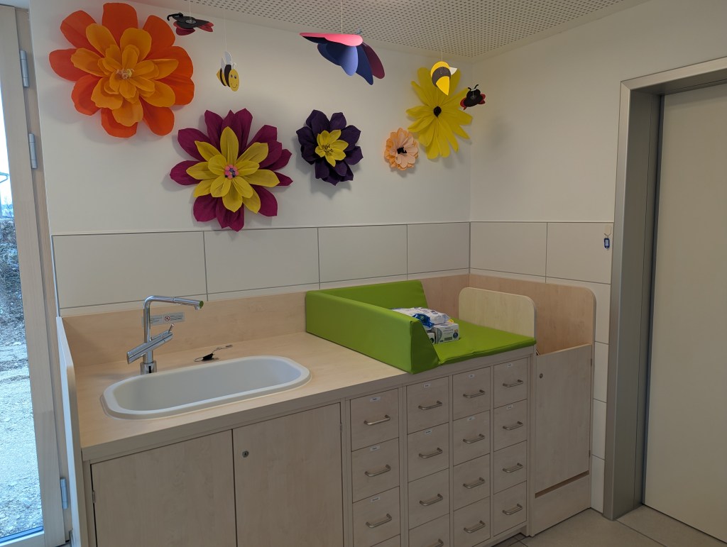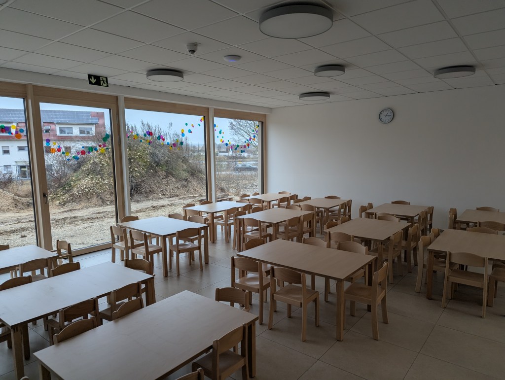 Seit dem 23. Februar 2026 sind wir in unserem Neubau in der Ziegeleistraße in Bechhofen. Wir haben zwei Krippengruppen, eine Mischgruppe und zwei Regelgruppen, dazu einen Bewegungsraum, zahlreiche Nebenräume, unsere Garderoben und einen großen Garten.