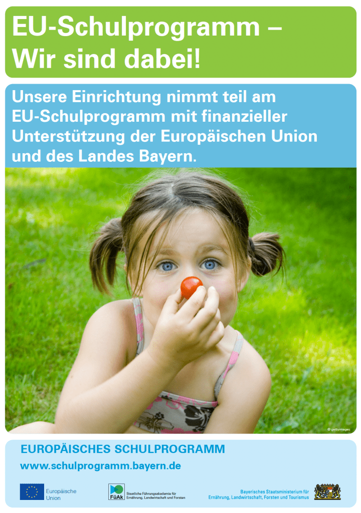 Unsere Kindertageseinrichtung nimmt am EU-Schulobstprogramm teil. Durch dieses Programm erhalten die Kinder regelmäßig frisches Obst und Gemüse, das ihnen kostenlos zur Verfügung gestellt wird. Ziel des Programms ist es, Kinder frühzeitig für eine gesunde und ausgewogene Ernährung zu sensibilisieren und ihnen den Wert frischer Lebensmittel näherzubringen.
